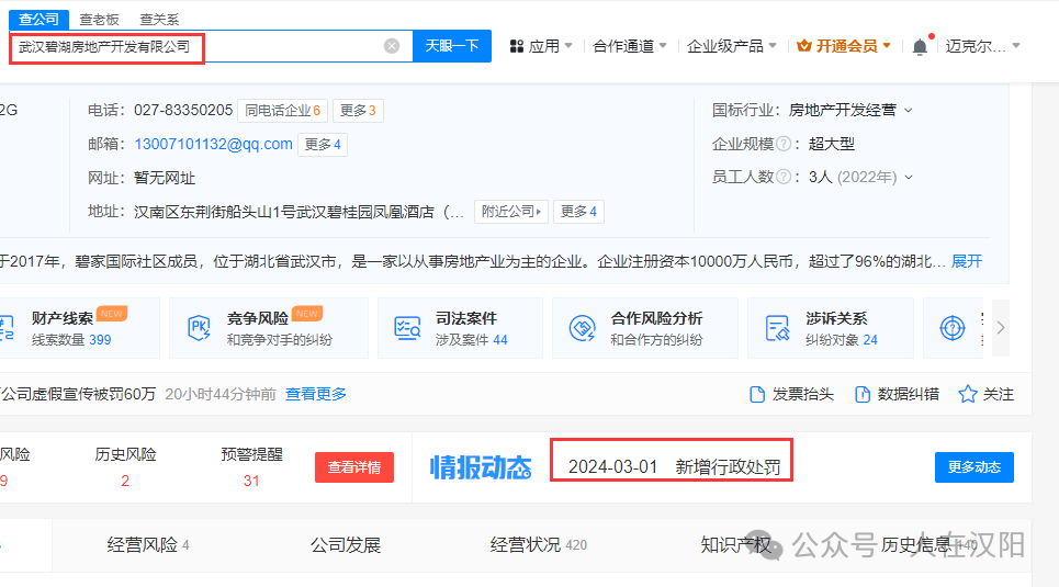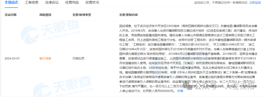 根据小编收集到的信息显示,该项目的开发商武汉碧湖房地产开发有限公司在3月1日新增了一条行政处罚信息。