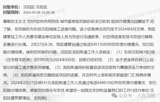 (3)龙阳街道将积极督促该项目部努力筹措资金力争按时交房。