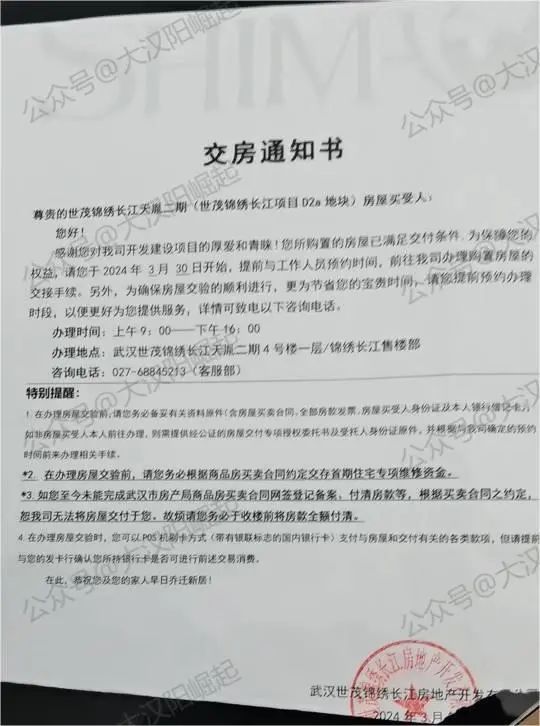 获悉,网友在武汉留言板爆料,位于汉阳区滨江地段的楼盘世茂天胤2期,开发商邮寄公章通知明天收房3月30日起开始收房。