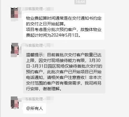 客服又联系我们说分批交房,什么时候收房还不知道,物业费就要从5月份开始计算了。