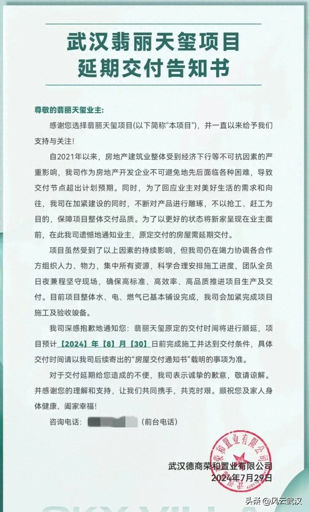 7月29日晚10点左右,武汉德商荣和置业有限公司发布《武汉翡丽天玺项目延期交付告知书》:原定的交付时间将顺延,项目预计2024年8月30日完成施工并达到交付条件。
