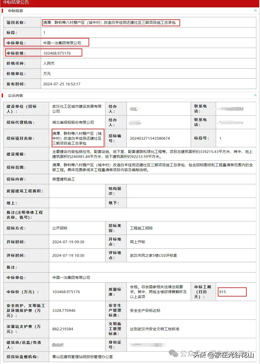 微信公众号家在光谷花山获悉:清潭、群利等八村棚户区(城中村)改造白羊佳苑还建社区三期项目施工总承包发布中标结果公示。