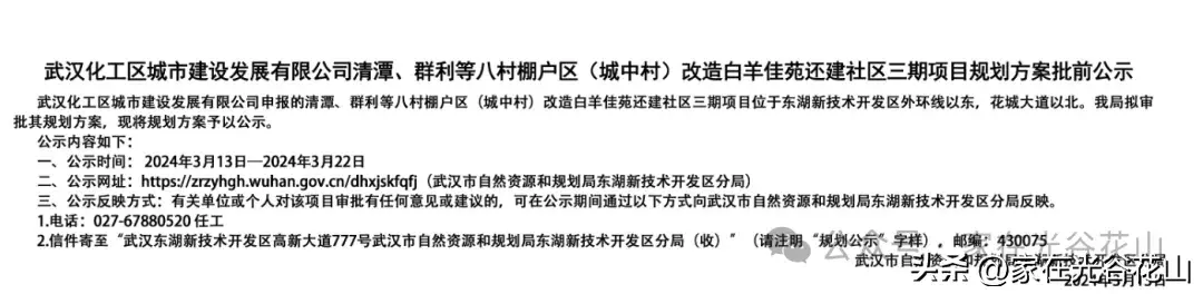 今年3月份武汉化工区城市建设发展有限公司清潭、群利等八村棚户区(城中村)改造白羊佳苑还建社区三期项目规划方案批前公示。