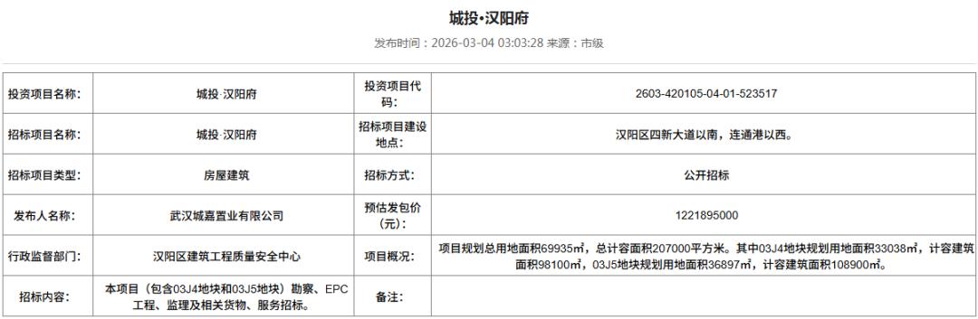 3月5日,小编看到一则关于“城投·汉阳府”的招标计划,该小区就是城投四新之光原商业地块的项目。