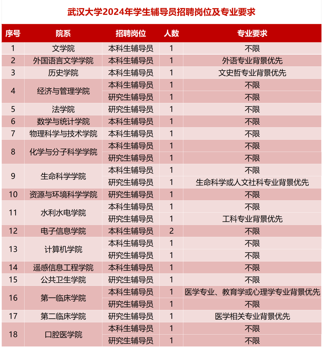 根据武汉大学2024年大学生思想政治教育工作要求和岗位需求,现公开招聘学生辅导员,具体如下。