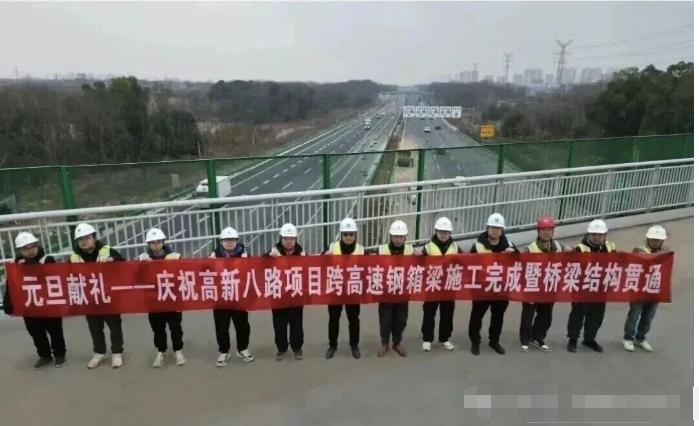 近日,高新八路项目跨武汉绕城高速钢箱梁施工顺利收官暨桥梁结构贯通,标志着项目跨高速作业结束。
