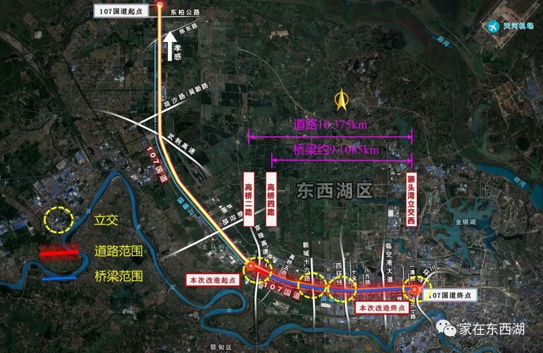 G107武汉市东西湖段是武汉市西部路网中横贯东西的城市快速路,道路全长3.423千米,主线宽50-95米,采用双向6-8车道设计。