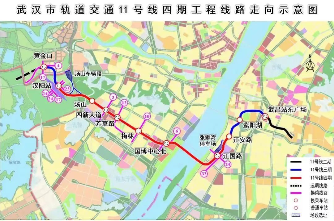 11号线四期自汉阳站至白沙洲,是支撑城市东西向垂江发展的重要轴线。线路起于汉阳站(不含),主要沿四新大道、规划道路,新武金堤路敷设,连接汉阳火车站、四新城市副中心及武昌白沙洲片区,止于11号线三期工程起点江安路站(不含)。线路全长16.2km,全地下敷设方式。设站6座(均为地下车站),其中换乘站5座。续建汤山车辆段。