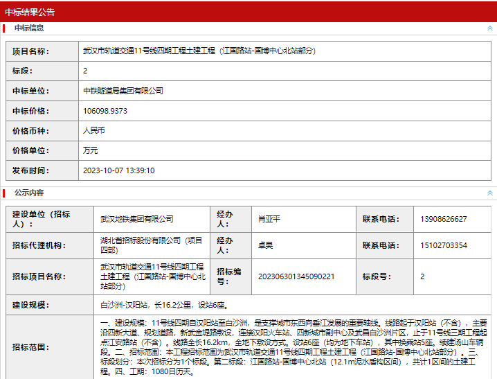 二、招标范围:本工程招标范围为武汉市轨道交通11号线四期工程土建工程(江国路站-国博中心北站部分)。