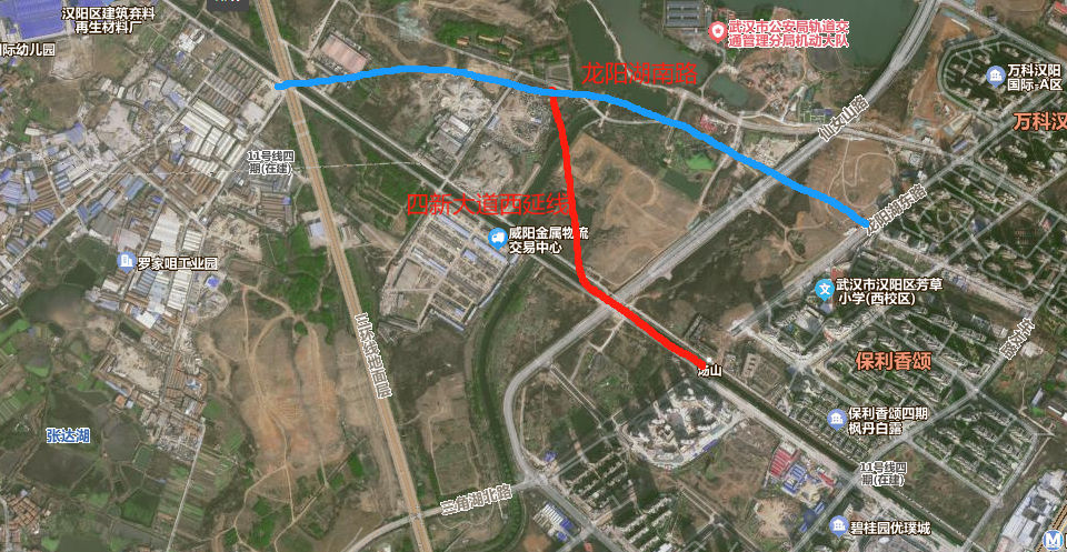 四新大道西延线(汉新大道~金龙南路)道路排水工程西起汉新大道,东至金龙南路,道路由西向东依次与规划汉新大道、现状仙女山路、规划金龙南路相交,相交道口均为“十字型”路口,拟建道路全长约 986m,红线宽 30~40m。项目完成后可使游客迅速到达龙阳湖公园,提高游客出行效率。