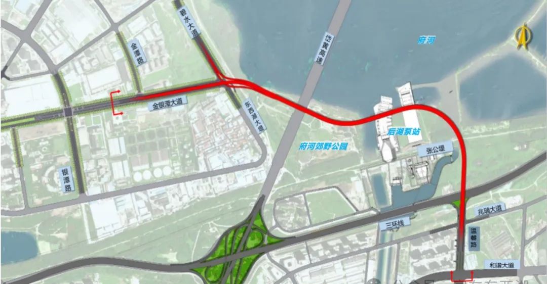温馨路北延(碧水大道~和谐大道)工程 西起金银潭大道,沿金银潭大道向东跨越东西湖大堤、府河郊野公园、岱黄高速、后湖泵站、张公堤、三环线后,向南衔接现状温馨路,止于温馨路-和谐大道路口。