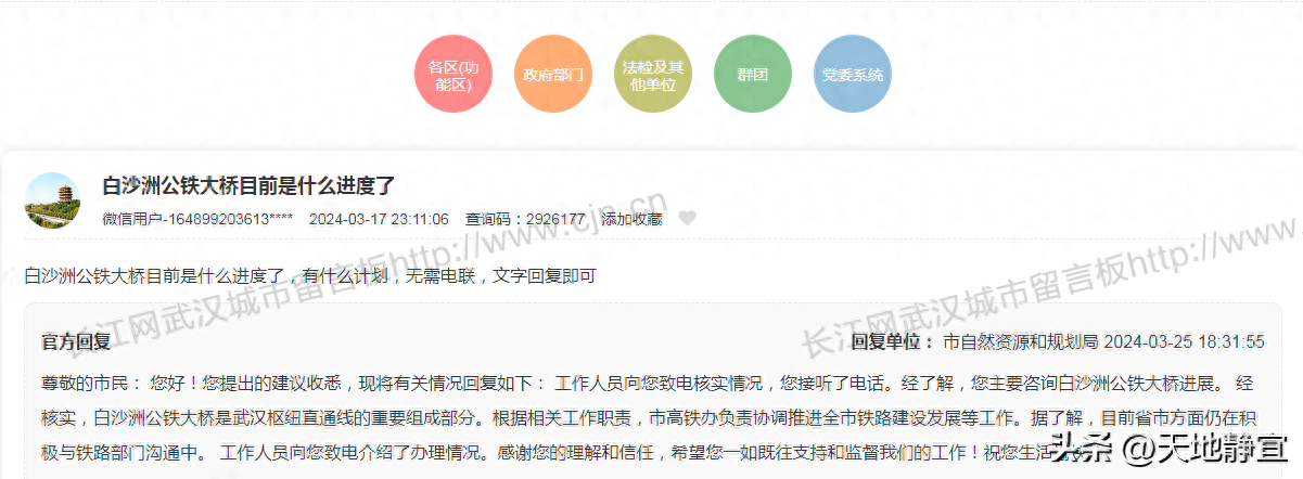 官方回复:经了解,您主要咨询白沙洲公铁大桥进展。 经核实,白沙洲公铁大桥是武汉枢纽直通线的重要组成部分。根据相关工作职责,市高铁办负责协调推进全市铁路建设发展等工作。据了解,目前省市方面仍在积极与铁路部门沟通中。
