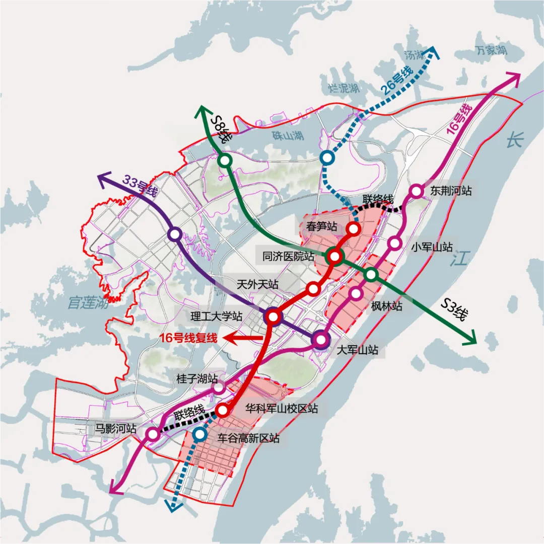 根据初步规划,轨道交通16号线复线将新建东荆河-春笋段-华科大军山校区-马影河段,线路总长15.19公里,暂定设春笋站、同济医院站、天外天站、理工大学站和华科大军山校区站等5座站点(不含接轨点)。