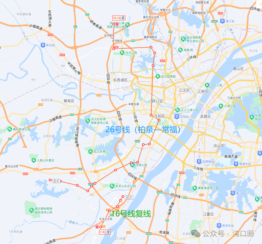 按照本次公布的16号线复线规划站点走向来看,26号线到常福和到军山新城是两个方向,一个向西,一个向南,也意味着26号线的终点将不再到常福,而是往汉南方向
