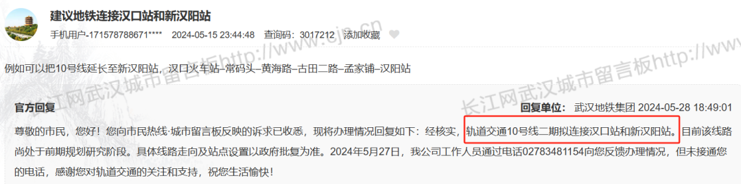 武汉地铁集团:“经核实,轨道交通10号线二期拟连接汉口站和新汉阳站。目前该线路尚处于前期规划研究阶段。具体线路走向及站点设置以政府批复为准。”