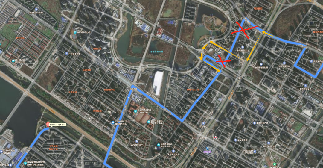 去行走向(汉阳大道周湾→ 蔷薇路江堤乡新村)由:四新北路、梅林西路、四新大道。临时调整至:四新北路、江城大道、梅林三街、凤凰湖环路、四新大道。