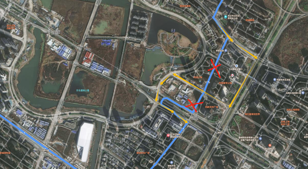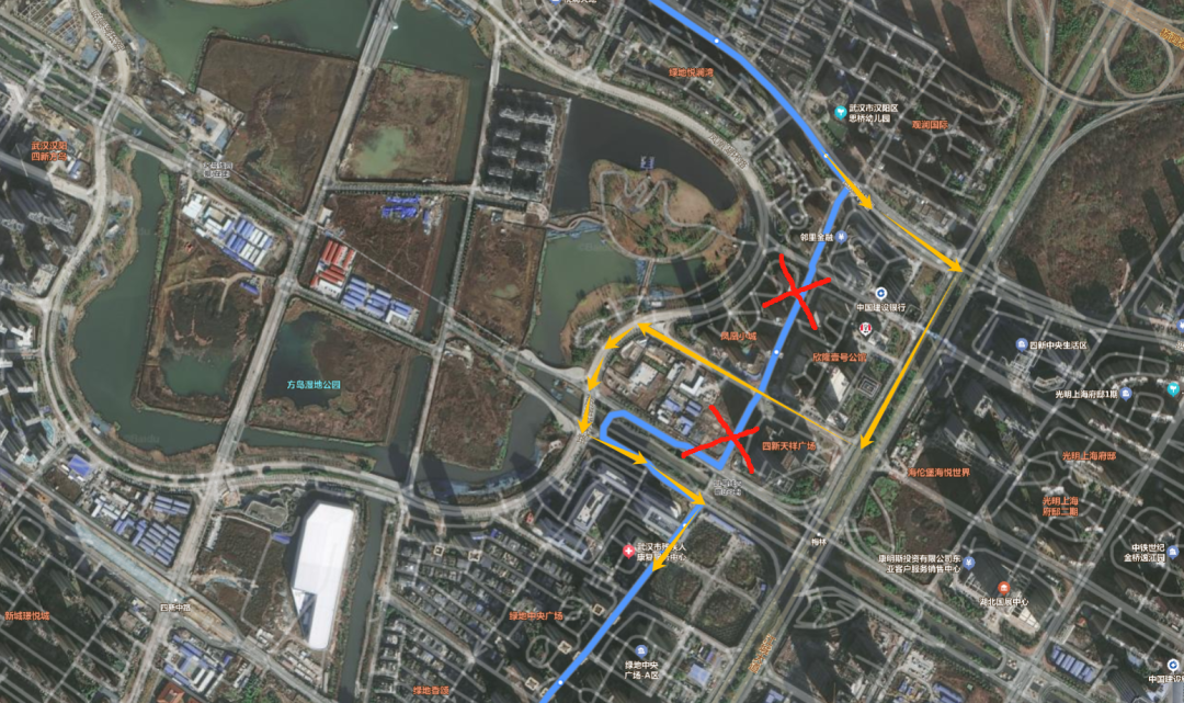 回行走向(沿河大道永宁巷→汉阳客运中心停车场)由:四新北路、梅林西路、四新大道。临时调整至:四新北路、江城大道、梅林三街、凤凰湖环路、四新大道。