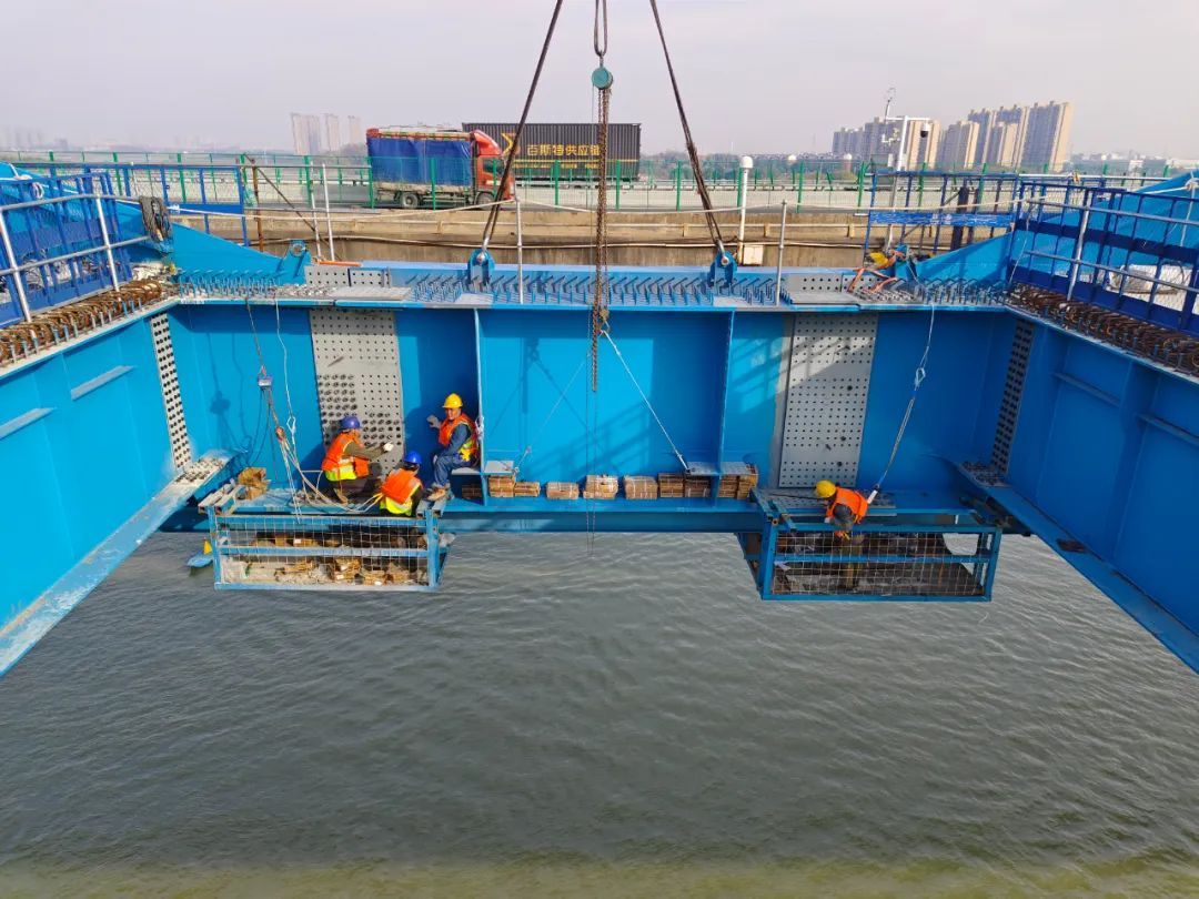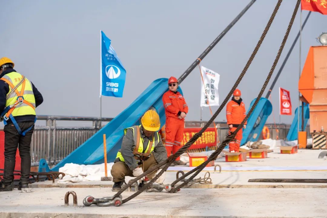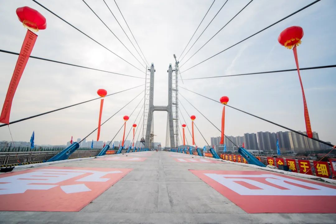 汉江特大桥全长1667米,索塔采用“花瓶形”,主塔高123米,全桥共144根斜拉索,单根最大重量16吨,最长约234米,大桥共37个节段。采用两台55T桅杆式起重机,创新可移动式平台、C型吊耳等多种工装设备,以“积木”搭接的方式和“温度配切法”实现大桥高精度合龙。从承台施工到节段梁安装,利用有限元进行仿真模拟分析,对索力、梁体应力、温度应力、标高和几何线型进行了全过程监测,准确地预测节段梁标高,最终在合龙施工时,两端钢梁高差小于3毫米,轴线偏差小于2毫米,索力最大偏差小于5.1%,远远高于规范要求,实现最终成桥线形优美、品质优良。