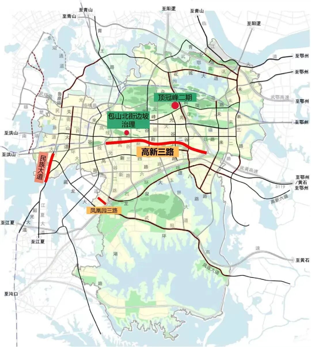 高新三路(三环线-外环线)改造提升工程西起三环线武黄立交,东至新建武东收费站,规划道路 全长约10.7公里 ,采用“主线高架6车道+地面道路6车道”设计。其中 高架快速路 8.23公里,设计时速80公里。