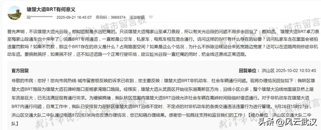 该市民称:雄楚大道BRT卓刀泉至梅家山段通车也十来年了,说是BRT专用通道,一直都是公交车,私家车,电瓶车相互混合通行。请问这样的BRT有什么存在的必要?请问私家车走在里面会被拍违章罚款吗?如果不罚款,那这个BRT存在的意义是什么?占用路面空间?如果是这么个情况,为什么不拆除沿线站台来拓宽路边宽度?还可以在道路两侧修建非机动车道。要搞就搞好,如果搞不好,还不如还道路一个正常行驶环境,建议趁光谷段一直烂尾的同时,把全线还原成正常道路。