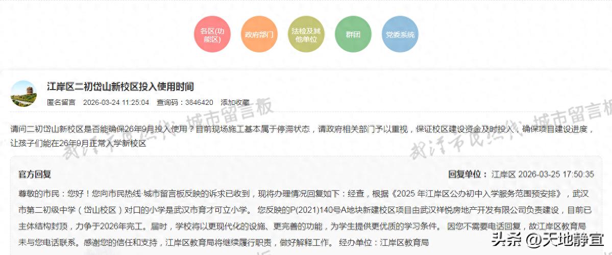 官方回复:经查,根据《2025 年江岸区公办初中入学服务范围预安排》,武汉市第二初级中学(岱山校区)对口的小学是武汉市育才可立小学。 您反映的P(2021)140号A地块新建校区项目由武汉祥悦房地产开发有限公司负责建设,目前已主体结构封顶,力争于2026年完工。届时,学校将以更现代化的设施、更完善的功能,为学生提供更优质的学习条件。
