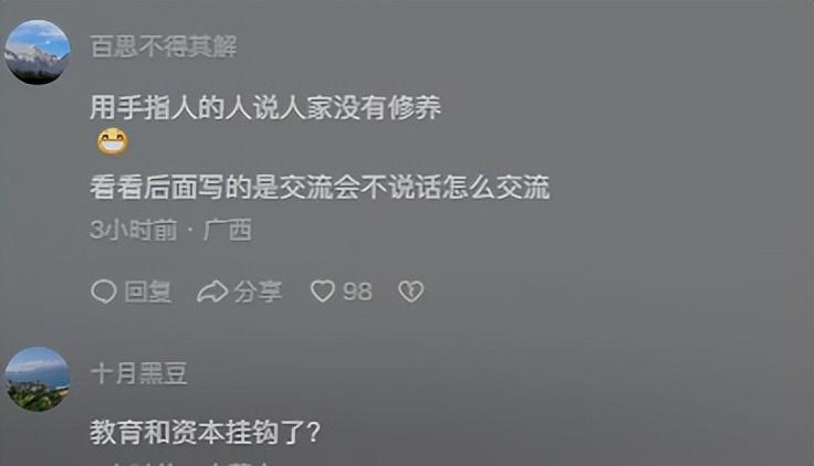 从视频中也可以看到,校方全程都是校董在说话,坐在旁边的老师都显得手足无措,有网友就认为“可以看到学校的管理模式”,还有网友表示“这是教育向资本妥协”