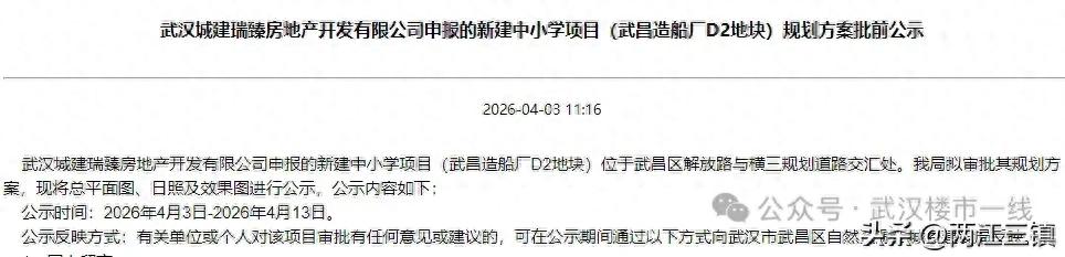 近日,武汉市规划局发布了武汉城建瑞臻房地产开发有限公司申报的新建中小学项目(武昌造船厂D2地块)规划方案批前公示,该项目即武汉长江天地配建的九年制学校。