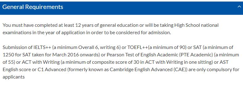 注:以上为大部分课程最低入学要求。非工、理科课程、医科、双学位及双主修课程对英语有较高的要求。