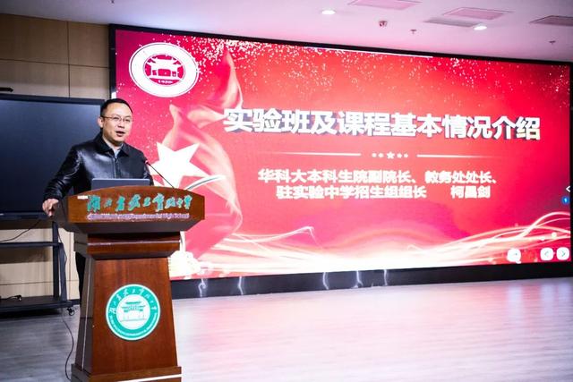 华科大本科生院副院长、教务处处长、驻实验中学招生组组长柯昌剑对实验班及先修课程开设背景进行了介绍。工程实践创新中心主任王书亭及武汉光电国家研究中心袁菁教授、机械科学与工程学院赵欢教授、光学与电子信息学院李政言教授和人工智能与自动化学院刘磊教授依次对实验班特色先修课程《硬科技漫谈》的课程内容进行了介绍。