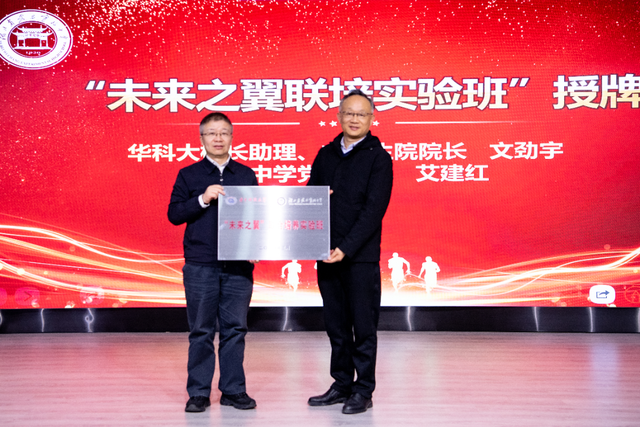 随后,华科大校长助理、本科生院院长文劲宇代表华科大为“未来之翼联培实验班”授牌,我校党委书记艾建红作为学校代表接受授牌。华科大未来技术学院执行院长唐明、我校教学副校长付娟分别代表华科大和实验中学向联培实验班特色先修课程《硬科技漫谈》的授课教师颁发聘书。