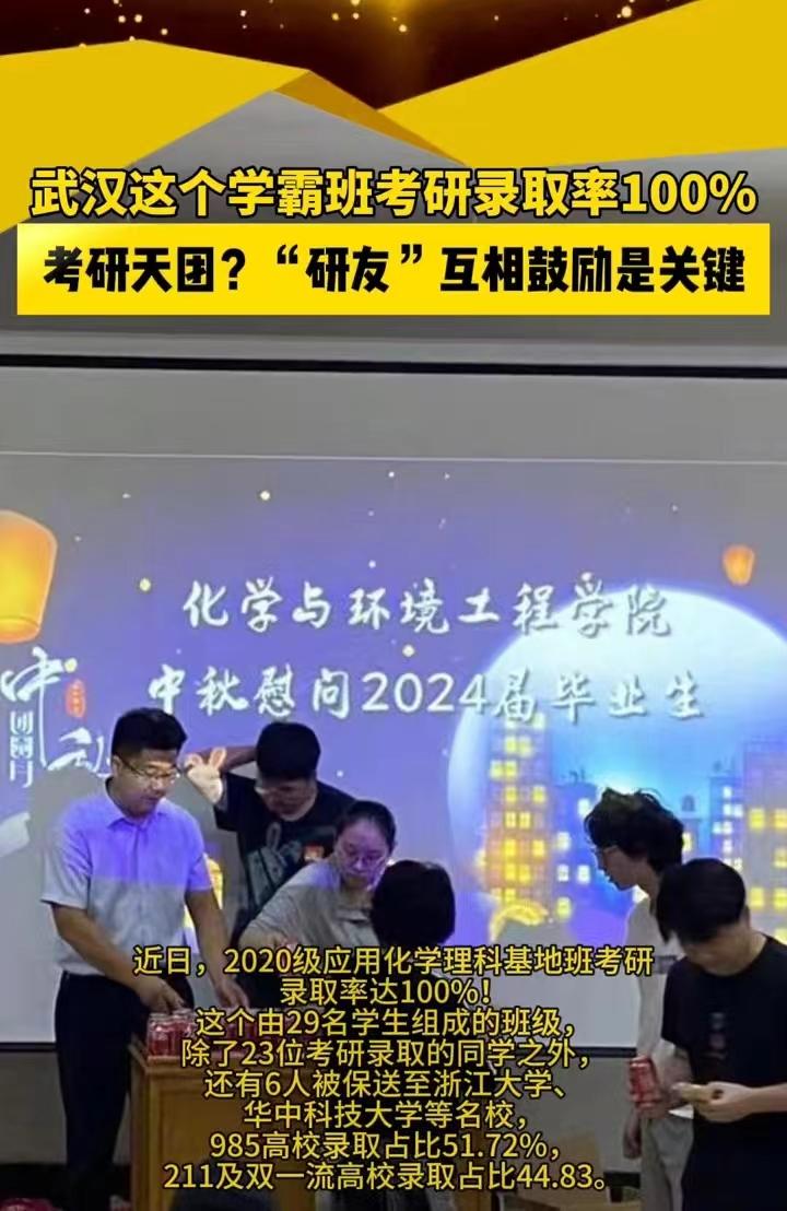 据极目新闻报道,湖北的武汉工程大学2020级应用化学理科基地班,全班29人考研全部考研上岸,录取率达到100%,被称为“学霸班”。