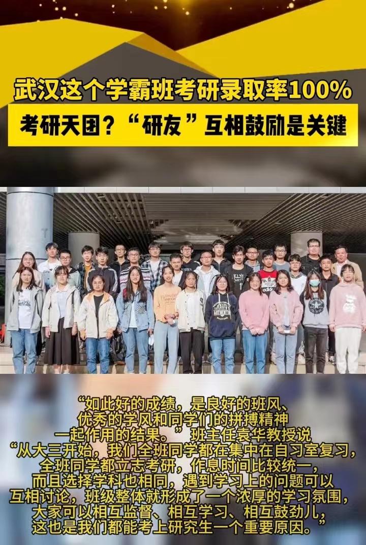 我觉得,武汉工程大学这个班级能够全员考研上岸,不管是班级的班风,还是寝室成员之间的互相影响和鼓励都说明一点,这个班级的所有学生,实力都不弱,而且在这样一个拥有良好学风的班级,环境对每个人都产生了良好的影响,或许也是大家都能上岸的关键因素。