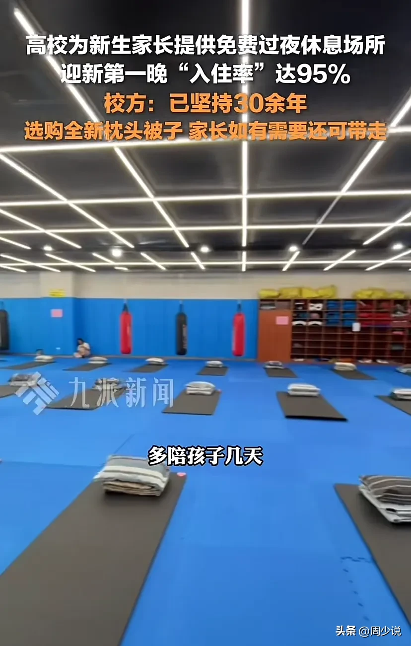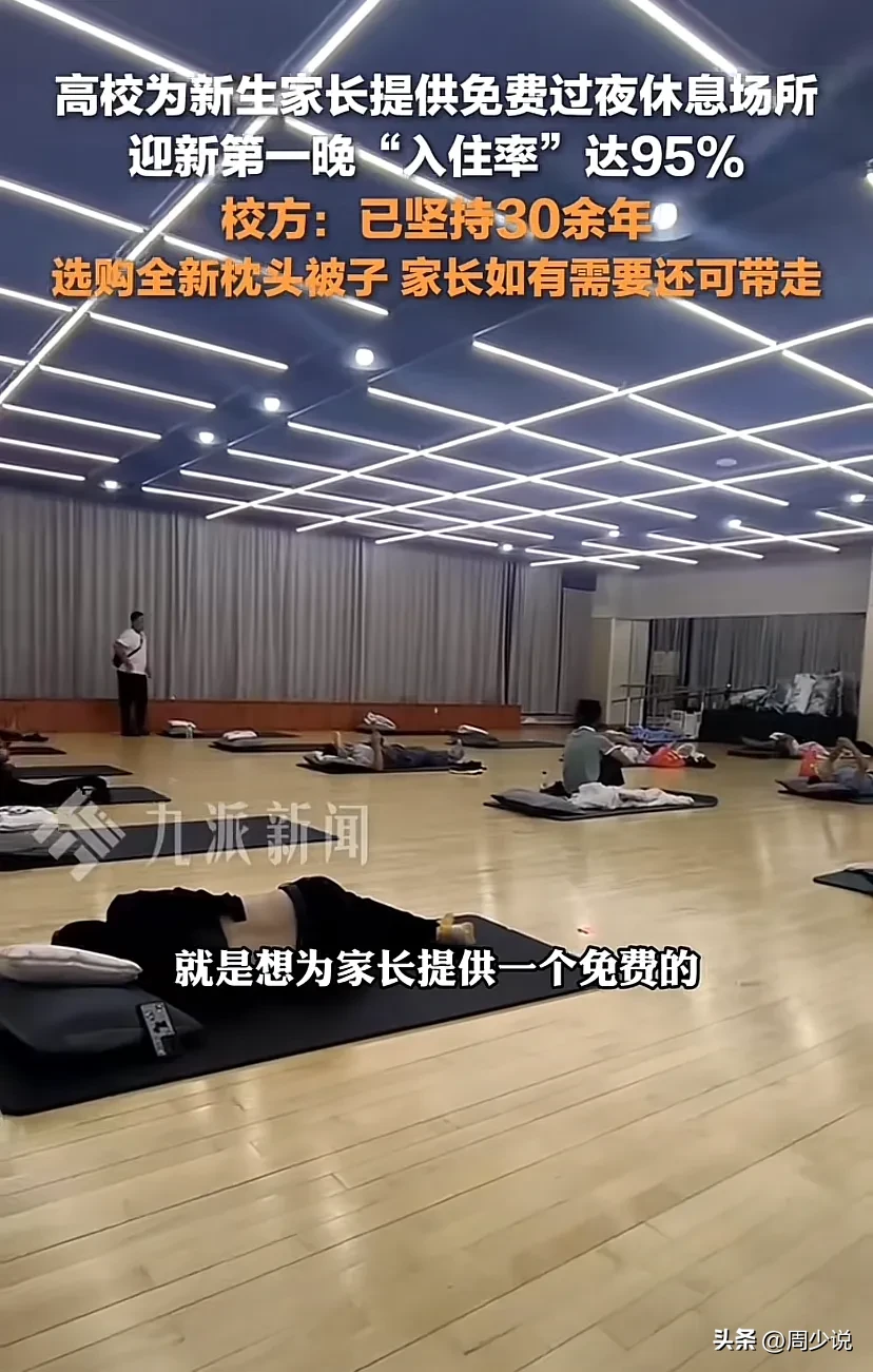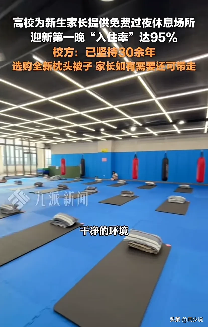 “泪奔!”湖北武汉,华中农业大学为了给新生家长提供免费的过夜休息场所,竟然在体育馆里面配备新购买的枕头和空调被,休息区分性别设置,男女区各30个位置,第一晚入住率就达到95%。