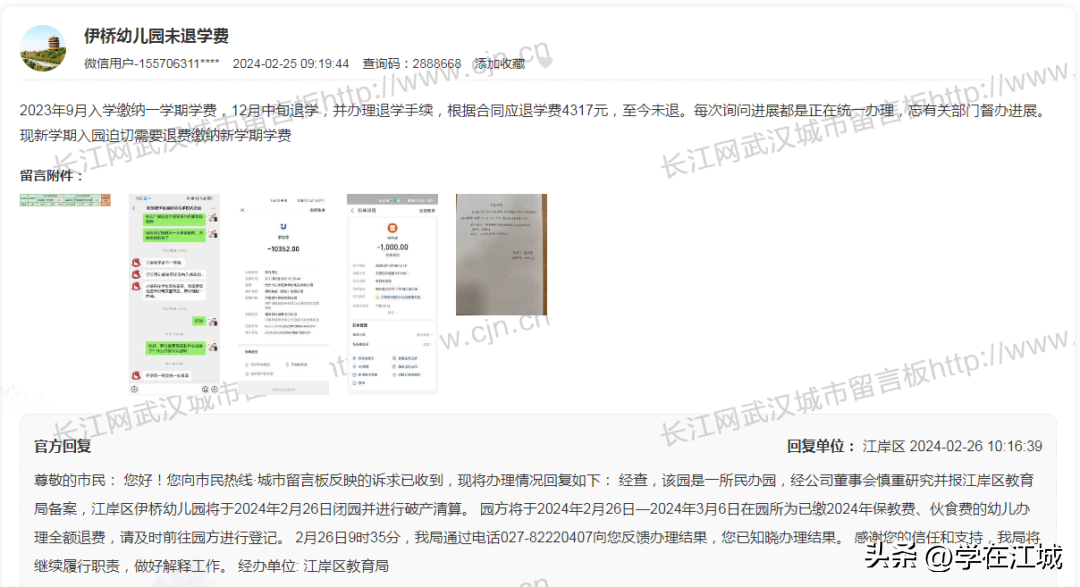 教育局回复:经查,该园是一所民办园,经公司董事会慎重研究并报江岸区教育局备案,江岸区伊桥幼儿园将于2024年2月26日闭园并进行破产清算。园方将于2024年2月26日—2024年3月6日在园所为已缴2024年保教费、伙食费的幼儿办理全额退费,请及时前往园方进行登记。