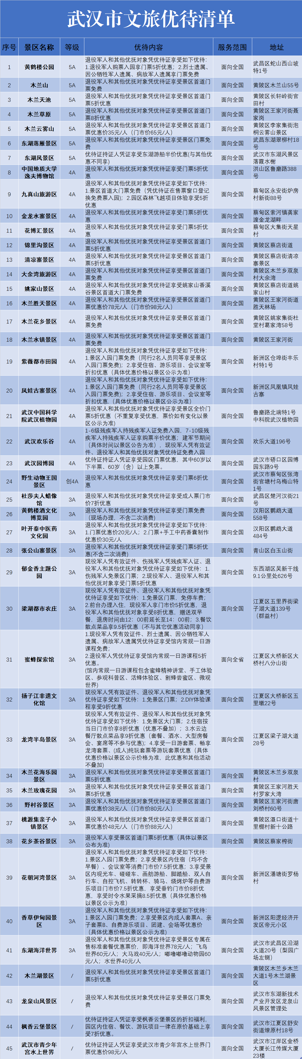 退役军人来武汉赏樱之时,不要忘了武汉市为我们准备的优待福利。根据武汉市退役军人事务局网站公布的有关消息,2022年以来武汉市先后发布三批退役军人和其他优抚对象优待服务项目。第一批18个项目,包括退役军人法律援助服务、部分景区门票优惠、江滩观光车免费、中百全球直销中心8折优惠等。第二批18个项目,主要是体育馆和健身场所。第三批42个项目,主要是文旅景区项目,其中 5A级景区包括:黄鹤楼公园、木兰山、木兰天池、木兰草原、木兰云雾山、东湖落雁景区。以下是武汉市45个面向全国退役军人和其他优抚对象的文旅优待清单汇总。