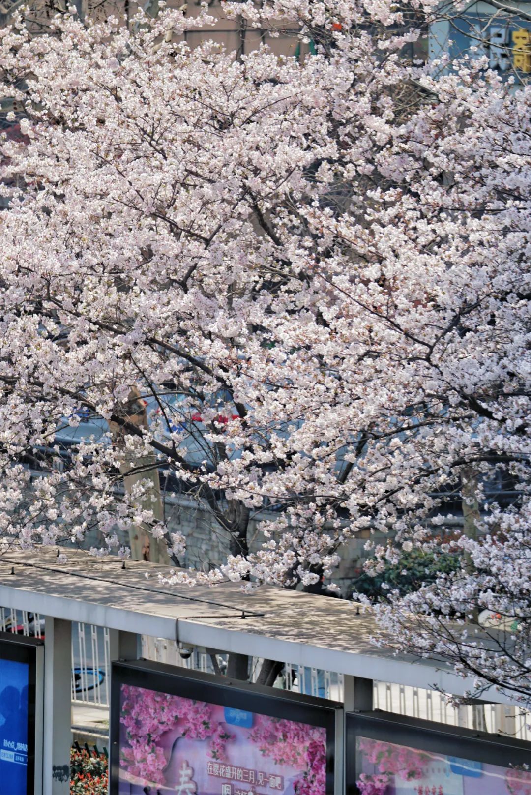 看到十几株正值盛花期的樱花树。