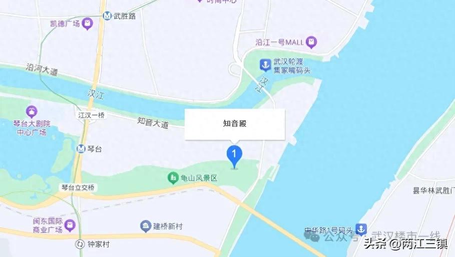 知音殿位于龟山风景区东北侧,北可俯瞰长江、汉江两江交汇,一览汉口、武昌核心滨江壮景,又紧邻龟山电视塔,改造后,集观景、文化体验与休闲娱乐于一体。