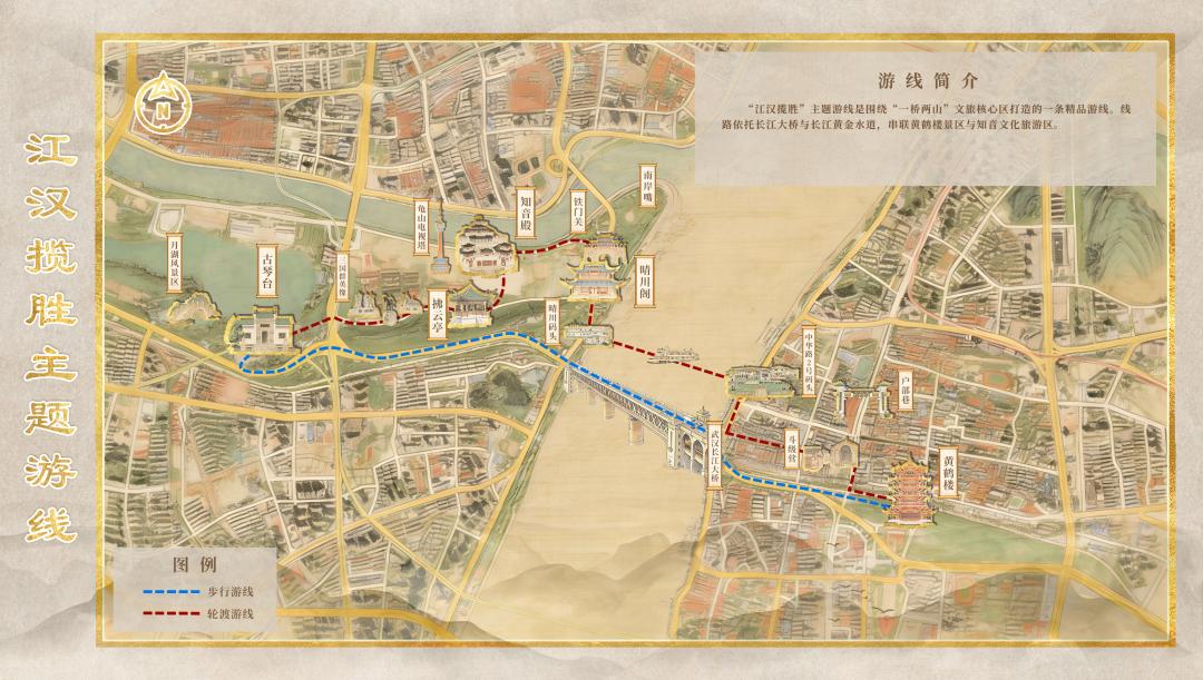 “江汉揽胜”主题游线自蛇山之巅黄鹤楼始,行经焕发新生的百年老街区斗级营与“舌尖江湖”户部巷,乘轮渡横渡长江,于航程中饱览“桥都”壮景与两岸风光,随后观赏汉阳江滩的晴川灯会,最后探访龟山之巅全新文旅地标——知音殿、游览古琴台。