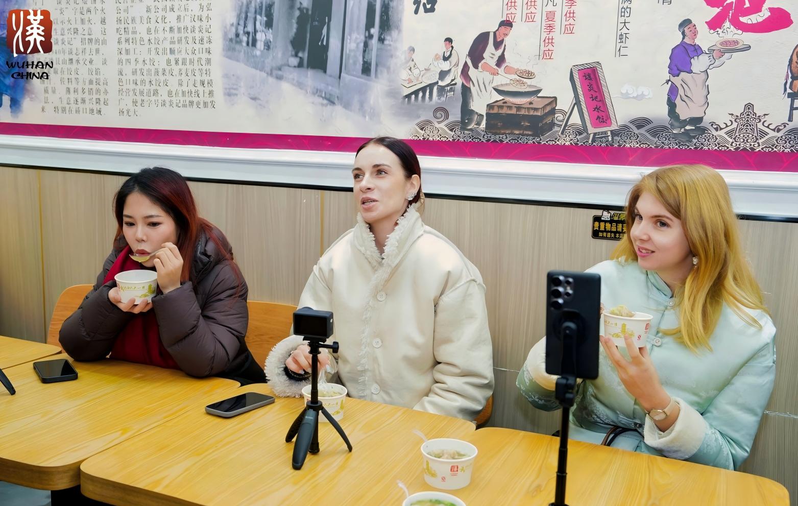 随后,达人团队转场吉庆民俗街——这里既是国家级旅游休闲街区,也是湖北省首批非遗特色街区。从群雕前聆听四季美的传承故事,到谈炎记品尝现煮水饺;从方言墙前学说武汉话,到汪玉霞品尝现炸京果;再到老通城的豆皮、曹祥泰的芝麻糕、德华楼的特色美食,每一处都让达人们驻足流连。大家与老字号非遗传承人亲切互动,沉浸式体验年货采买乐趣,镜头里留存的不只是舌尖滋味,更是武汉刻在烟火里的年俗印记。
