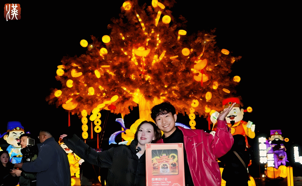 1月31日晚,行程最后一站迎来高潮——第十届武汉园博园灯会。还未入园,达人们已被璀璨灯火吸引。入口处,气势恢宏的门楼上,骏马奔腾、宫灯缓缓转动,让达人们纷纷举起手机记录。马来西亚博主Chloe惊叹:“骏马充满力量感,灯光让它看起来在动,太酷了!”