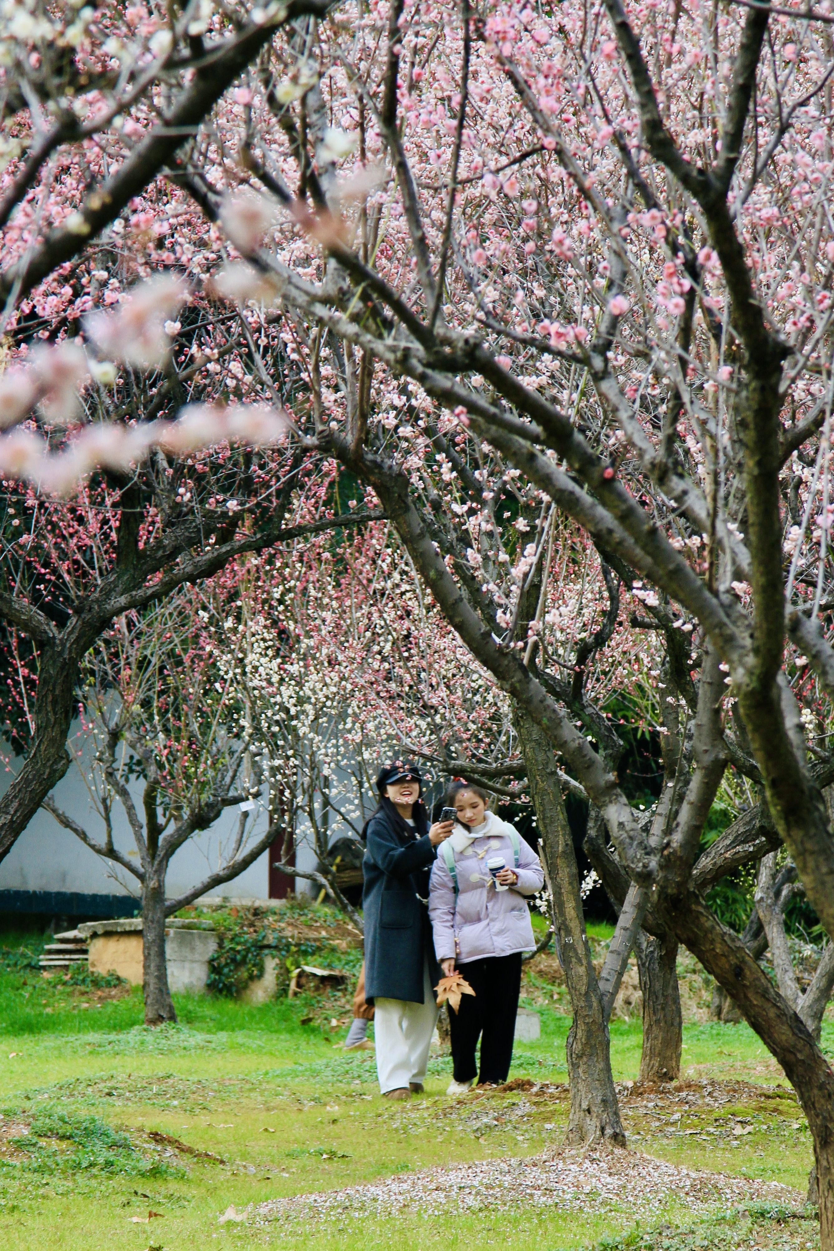 2月的阳光温暖和煦,梅园中红梅似火、白梅如雪、粉梅若霞。记者在现场看到,园内游人络绎不绝,既有携家带口的本地市民,也有慕名而来的外地游客。不少摄影爱好者端着“长枪短炮”,专注地捕捉梅花风姿与蜂蝶嬉戏的瞬间。更有年轻游客身着汉服、唐装等传统服饰,在梅林间拍照留念,裙裾飘飘与疏影横斜的梅枝相得益彰,引得过往游客纷纷驻足。