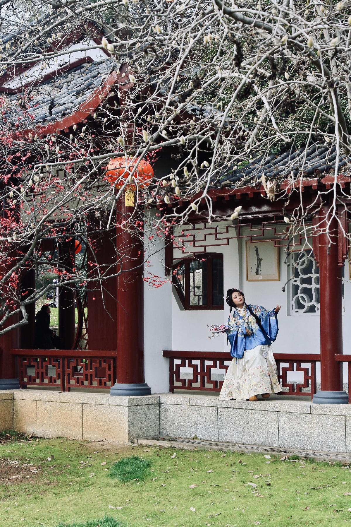游客身穿古风服饰在东湖梅园内拍照留念。