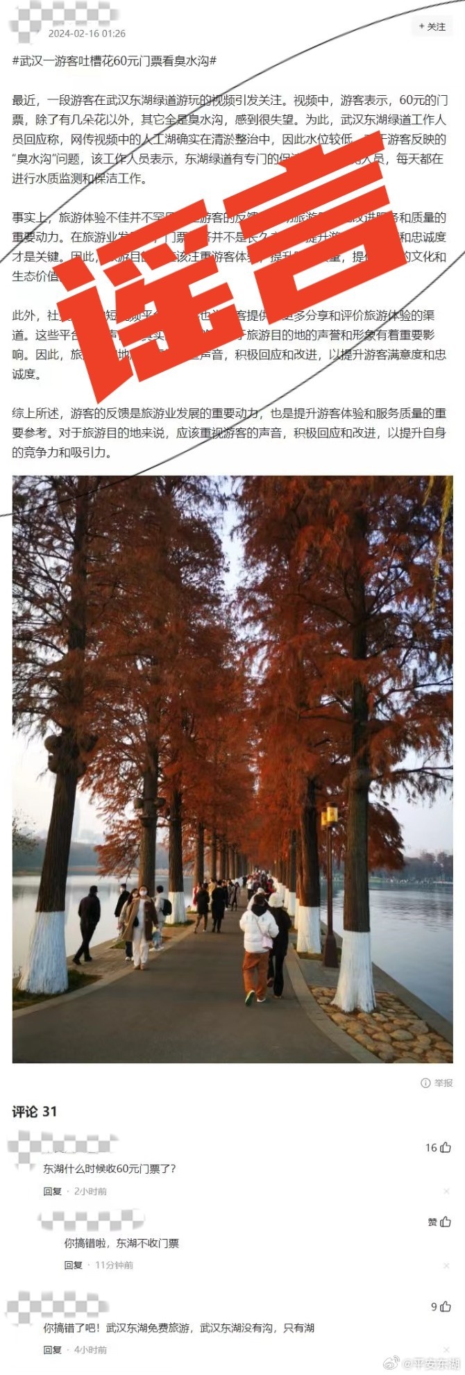 东湖绿道并未设置门票收费,王某的行为涉嫌网上制造谣言。