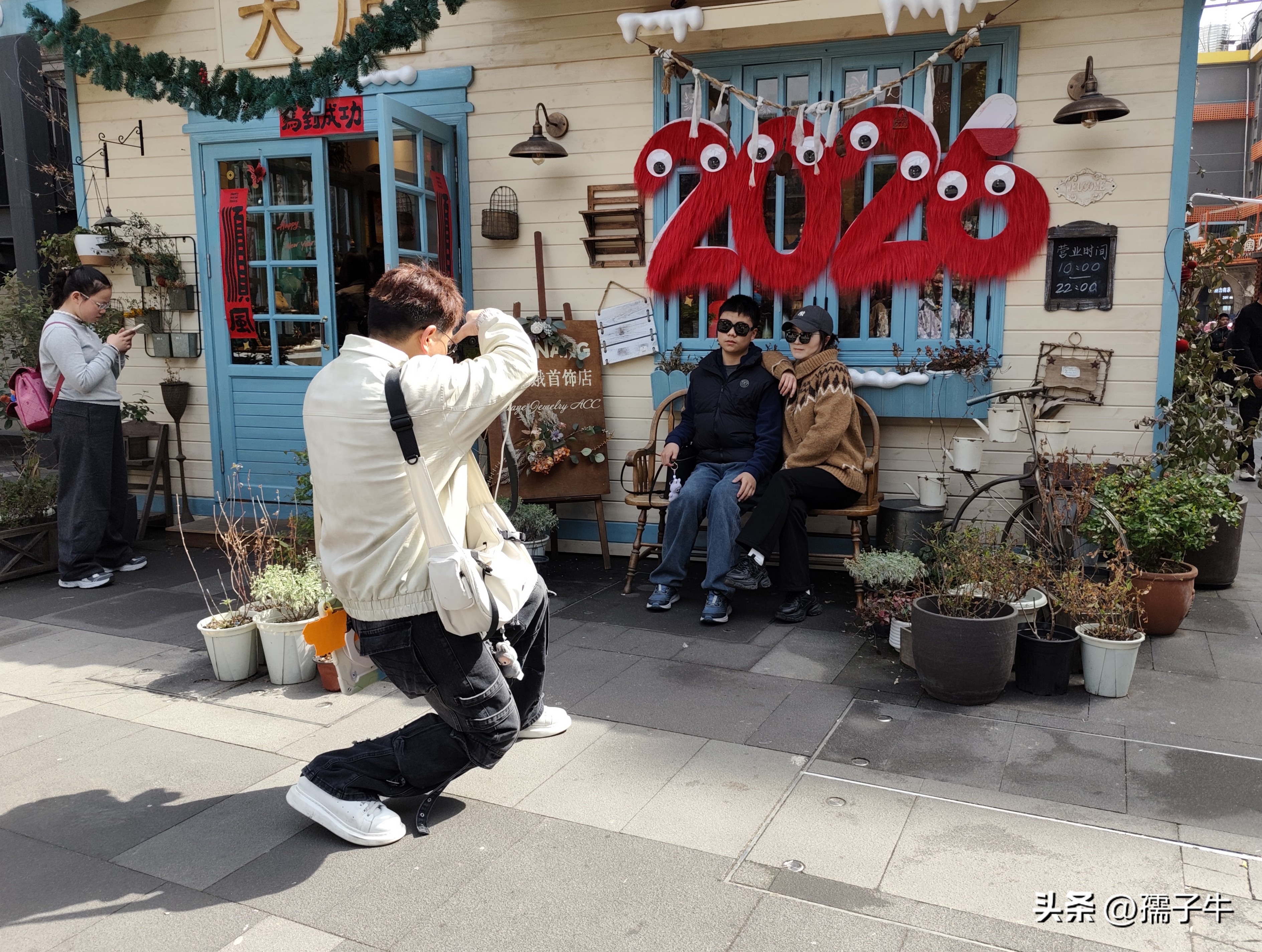 这家咖啡馆把门前的方寸之地打理得像个小花园,铁艺的椅子上铺着格子软垫,墙上挂着火红的2026,一对情侣举着咖啡杯对着镜头笑,快门声清脆。