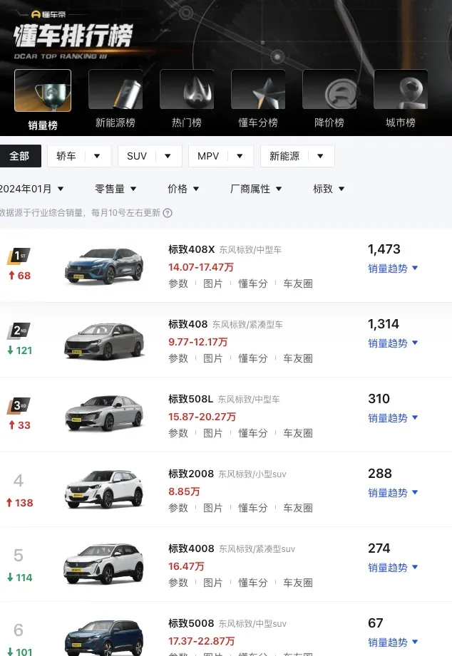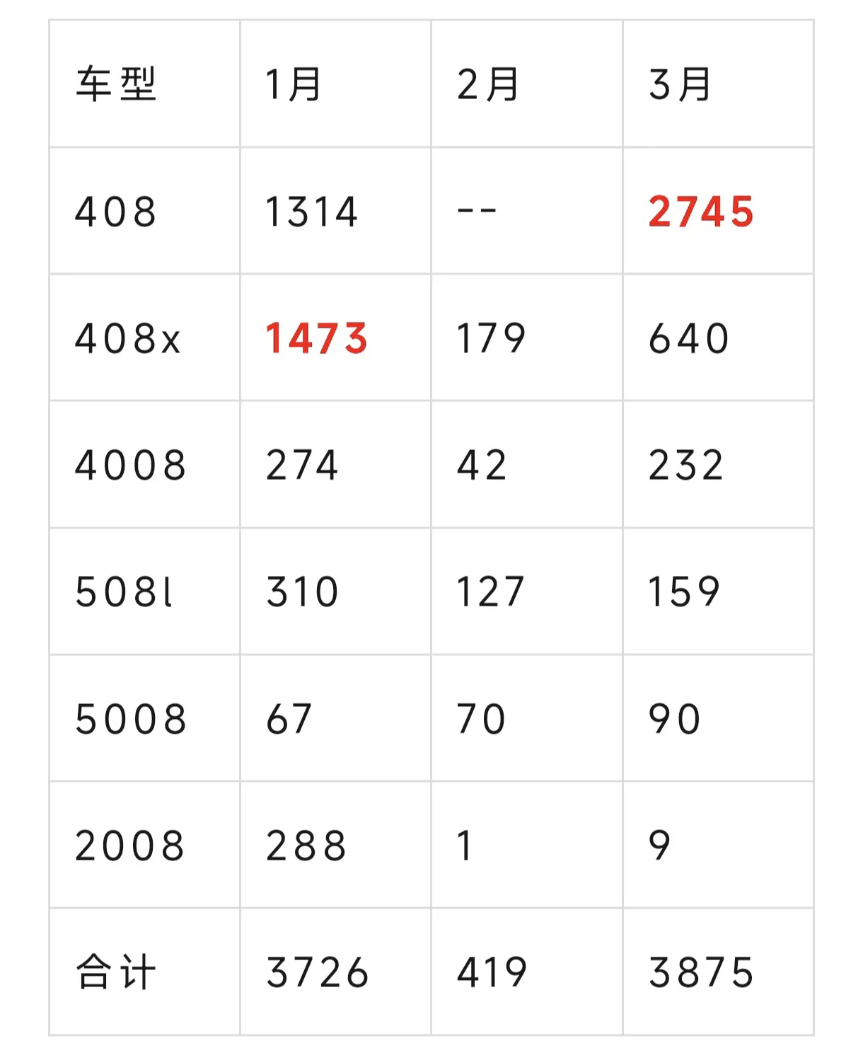 东风标致汽车,距离退出中国不远了。标致汽车,2024年1季度销量共计7000台左右,评论到每个月就2000台,目前最走量的车型是408,但是每个月销量接近1000台左右。去年上市的408X,每个月才500台左右,没有任何竞争力了。面对中国车市新能源的火热,标致汽车至今没有退出适合中国市场的新能源车型。由此可见,法国标致雪铁龙集团,已经正式放弃了中国的标致雪铁龙汽车了。据可靠消息,标致雪铁龙汽车在中国的合资公司神龙汽车有限公司,近期进行了人事变革,总经理重新更换了人员,且武汉第三工厂正式被东风汽车买下了,以后用于生产东风的自主新能源汽车。由此可见,东风标致,东风雪铁龙,即将退出中国市场。大家觉得呢?欢迎评论留言!