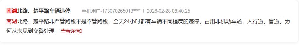 关于违停,市公安交管局一直以来的回复均是:已安排巡逻交警在此路段不间断巡查,对影响交通通行的车辆进行劝离及清理,对拒不驶离车辆一律予以摄像取证并粘贴违停告知单或拖移。同时会告诫车主此路段禁止车辆乱停乱放,不得妨碍交通和他人出行。