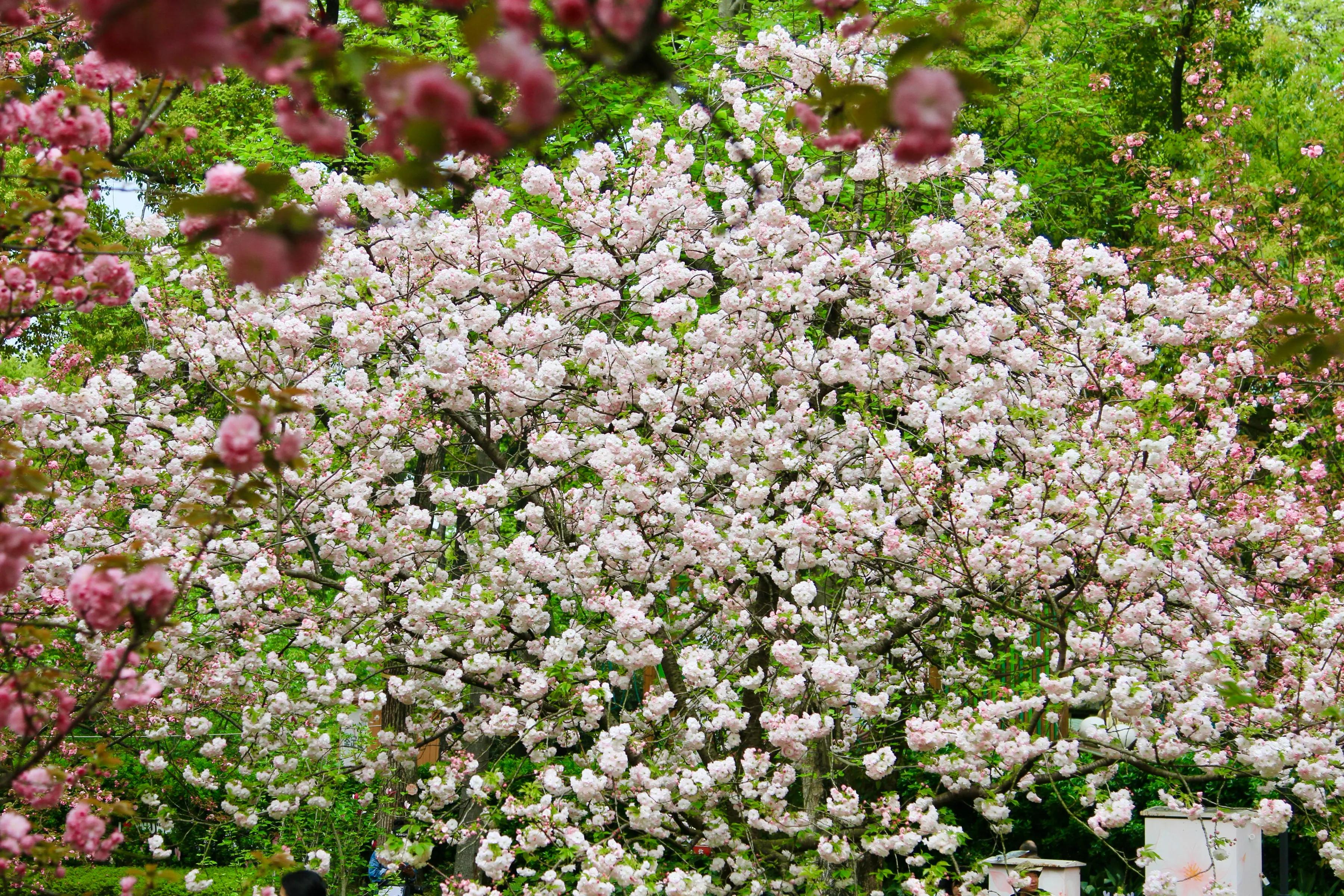 园内郁金、御衣黄、关山、松月、普贤象、太白等晚樱品种各具风情:郁金、御衣黄作为珍稀绿樱,清新雅致;关山、松月等品种或绯红热烈,或粉白柔美,缀满枝头。