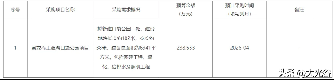 藏龙岛居民又添休闲好去处!近日,上潭湖口袋公园项目政府采购意向正式公布。项目拟新建口袋公园一处,地块长约182米、宽约38米,总面积6941㎡,涵盖园建、绿化、给排水及照明工程。项目预算238.533万元,预计2026年4月启动采购。