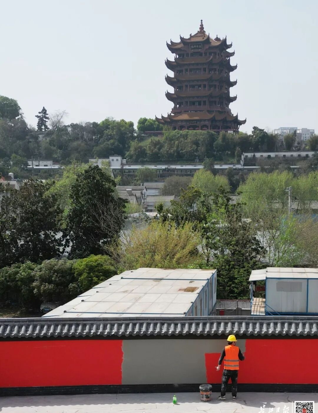 记者在现场看到,司门口黄鹤楼站红墙升级施工现场一派繁忙:施工人员分工协作,有的给墙面刷漆,有的移栽苗木,各项工序有序推进,进行最后的冲刺。远处黄鹤楼巍峨矗立,飞檐翘角与施工现场相映成趣。不少市民与游客被这忙碌景象吸引,纷纷向工作人员打听“新红墙”建成时间。