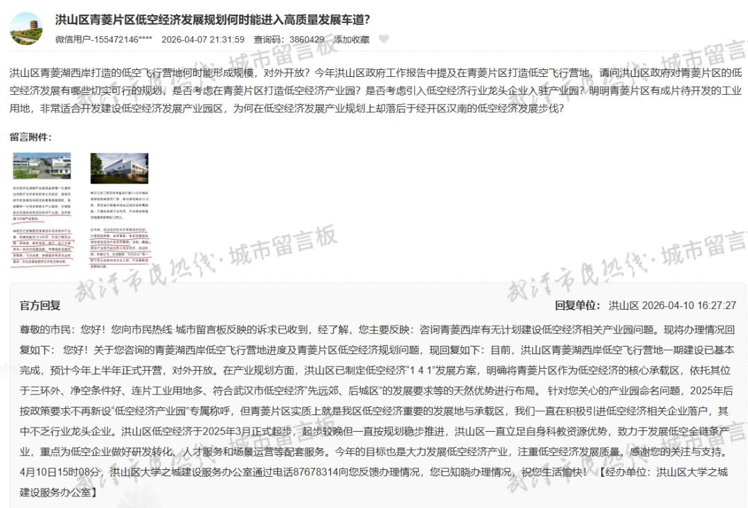 近日有市民咨询: 洪山区青菱湖西岸打造的低空飞行营地何时能形成规模,对外开放?今年洪山区政府工作报告中提及在青菱片区打造低空飞行营地,请问洪山区政府对青菱片区的低空经济发展有哪些切实可行的规划,是否考虑在青菱片区打造低空经济产业园?是否考虑引入低空经济行业龙头企业入驻产业园?明明青菱片区有成片待开发的工业用地,非常适合开发建设低空经济发展产业园区,为何在低空经济发展产业规划上却落后于经开区汉南的低空经济发展步伐?